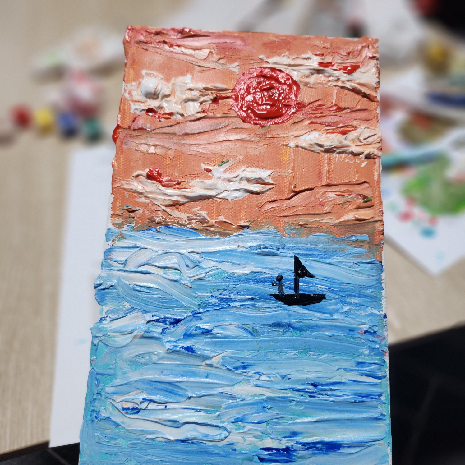 작품이 완성된 모습인데요 저는 노을이 지는 바다를 표현해 보았습니다. 그위로 지나가는 한 척의 돛단배가 좀 여유롭게 느껴지지 않나요? 저만의 작품이지만 주말을 좀 알차게 보낸 것 같아 내심 뿌듯했습니다.